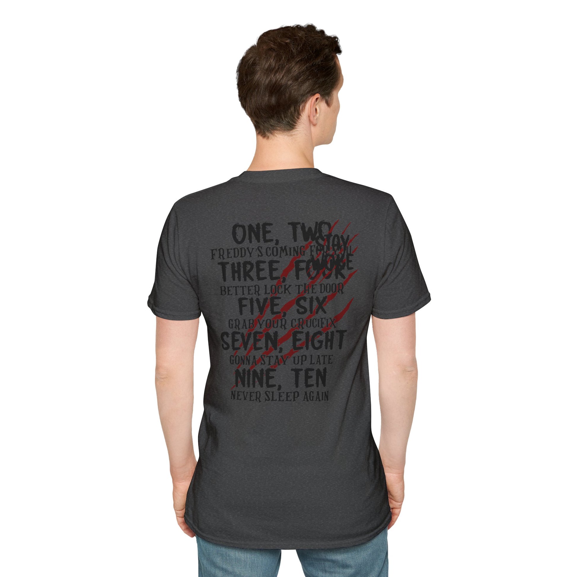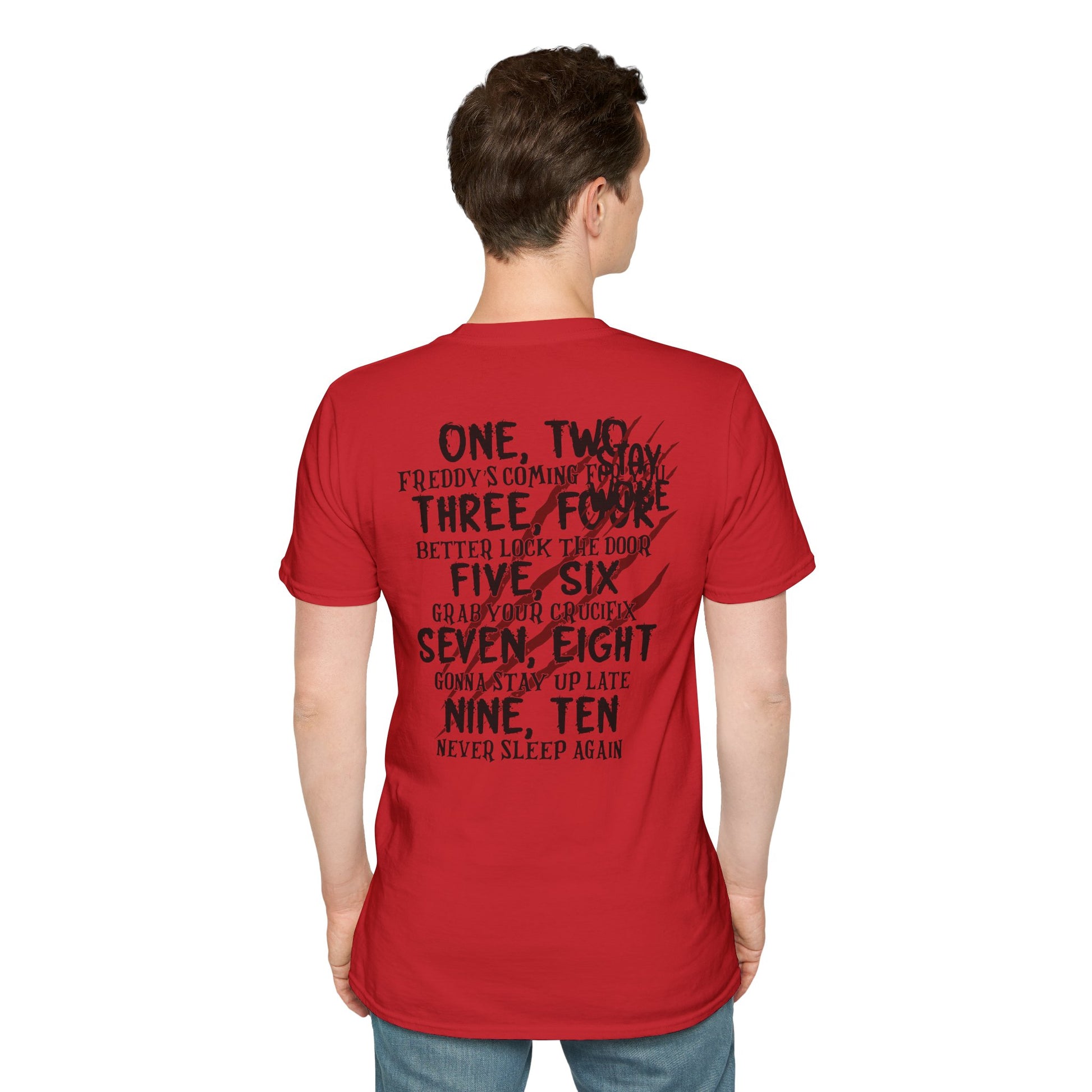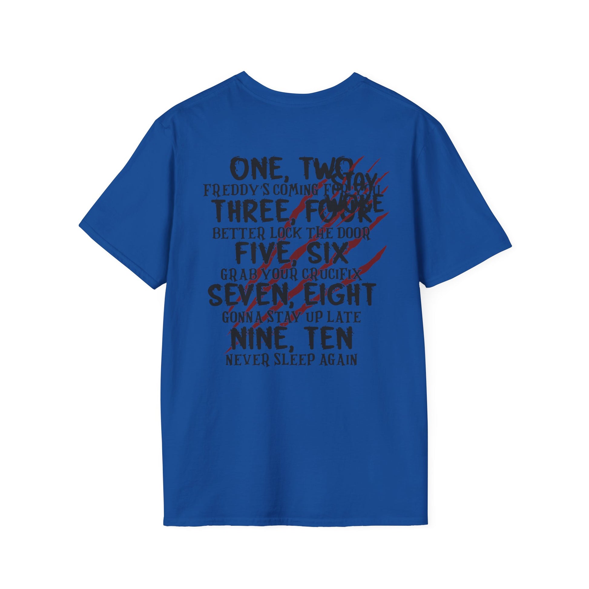 A horror-themed unisex T-Shirt perfect for those who love spooky nights and nightmare vibes. This softstyle shirt with a two sided design is made from durable and smooth fabric.